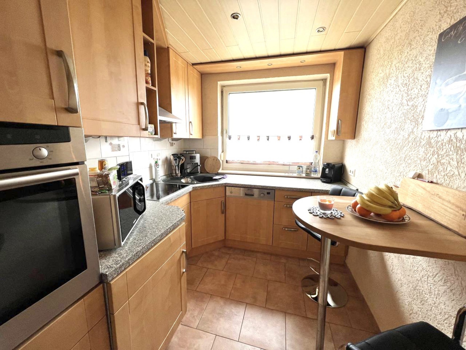 Die Einbauküche gehört zum Inventar. Sie ist mit allen Elektrogeräten ausgestattet und überzeugt mit einem Tresen und Sitzhockern.